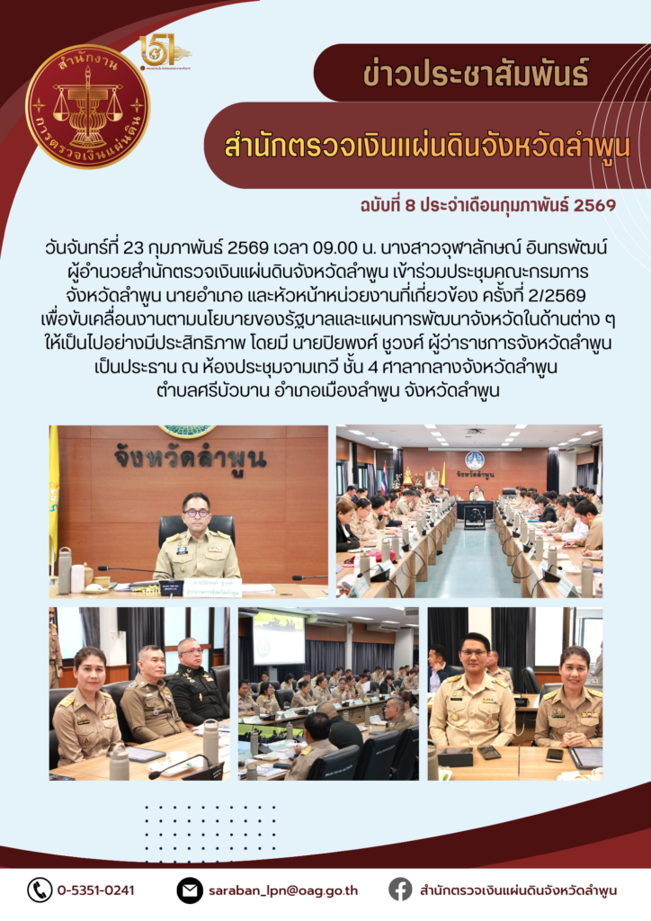 วันจันทร์ที่ 23 กุมภาพันธ์ 2569 เวลา 09.00 น. นางสาวจุฬาลักษณ์ อินทรพัฒน์ ผู้อำนวยการสำนักตรวจเงินแผ่นดินจังหวัดลำพูน เข้าร่วมประชุมคณะกรมการจังหวัดลำพูน นายอำเภอ และหัวหน้าหน่วยงานที่เกี่ยวข้อง ครั้งที่ 2/2569 เพื่อขับเคลื่อนงานตามนโยบายของรัฐบาลและแผนการพัฒนาจังหวัดในด้านต่าง ๆ ให้เป็นไปอย่างมีประสิทธิภาพ โดยมี นายปิยพงศ์ ชูวงศ์ ผู้ว่าราชการจังหวัดลำพูน เป็นประธาน ณ ห้องประชุมจามเทวี ชั้น 4 ศาลากลางจังหวัดลำพูน ตำบลศรีบัวบาน อำเภอเมืองลำพูน จังหวัดลำพูน
