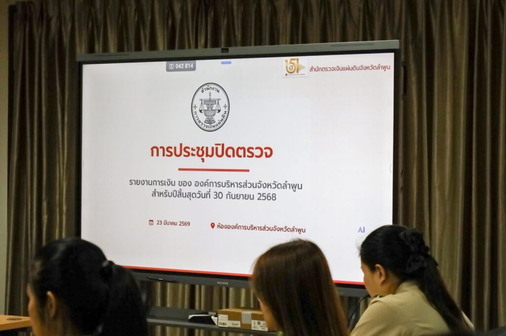 วันจันทร์ที่ 23 มีนาคม 2569 นางสาวจุฬาลักษณ์ อินทรพัฒน์ ผู้อำนวยการสำนักตรวจเงินแผ่นดินจังหวัดลำพูน พร้อมด้วยข้าราชการในสังกัด ร่วมประชุมปิดการตรวจสอบกับองค์การบริหารส่วนจังหวัดลำพูน เพื่อสรุปผลการตรวจสอบและเปิดโอกาสให้หน่วยรับตรวจได้ชี้แจงและอธิบายรายละเอียดข้อเท็จจริงตามข้อตรวจพบ โดย นายวีรเดช ภู่พิสิฐ นายกองค์การบริหารส่วนจังหวัดลำพูน มอบหมายให้ นายไพรัช ยะสง่า รองนายกองค์การบริหารส่วนจังหวัดลำพูน เป็นประธาน ณ ห้องประชุมซอมพอ ชั้น 3 องค์การบริหารส่วนจังหวัดลำพูน ตำบลป่าสัก อำเภอเมืองลำพูน จังหวัดลำพูน