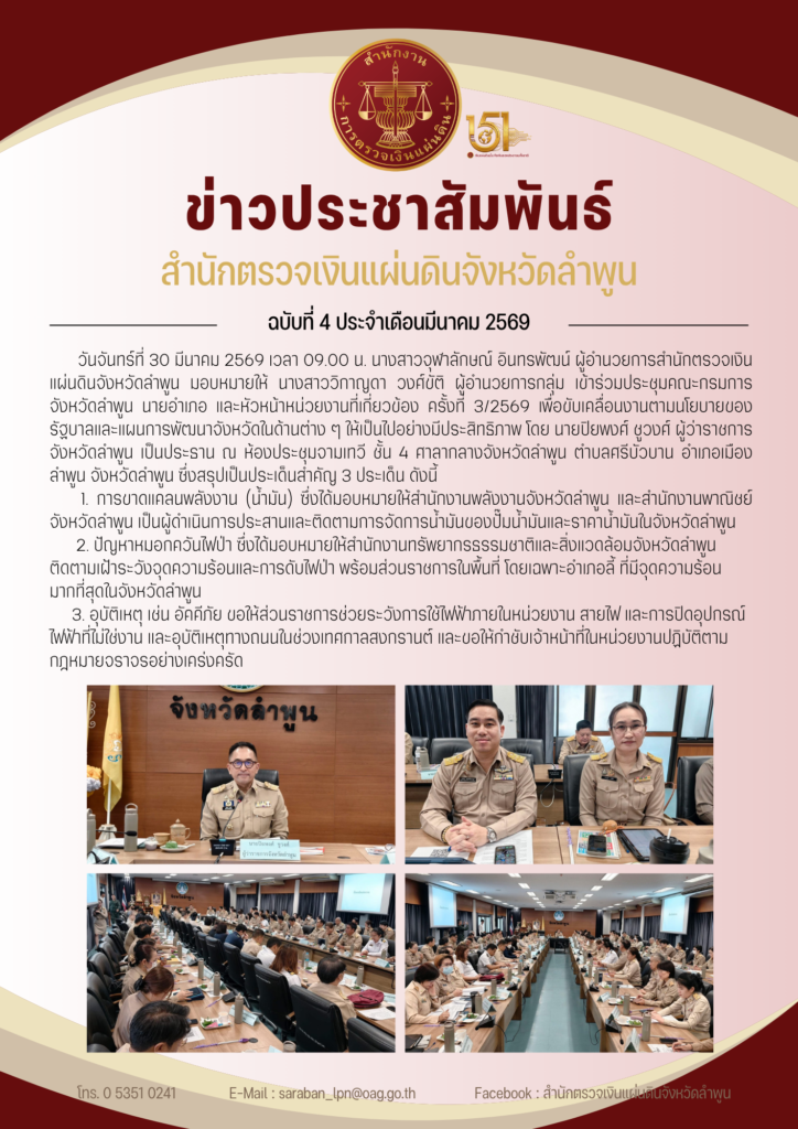 วันจันทร์ที่ 30 มีนาคม 2569 เวลา 09.00 น. นางสาวจุฬาลักษณ์ อินทรพัฒน์ ผู้อำนวยการสำนักตรวจเงินแผ่นดินจังหวัดลำพูน มอบหมายให้ นางสาววิกาญดา วงศ์ขัติ ผู้อำนวยการกลุ่ม เข้าร่วมประชุมคณะกรมการจังหวัดลำพูน นายอำเภอ และหัวหน้าหน่วยงานที่เกี่ยวข้อง ครั้งที่ 3/2569 เพื่อขับเคลื่อนงานตามนโยบายของรัฐบาลและแผนการพัฒนาจังหวัดในด้านต่าง ๆ ให้เป็นไปอย่างมีประสิทธิภาพ โดยมี นายปิยพงศ์ ชูวงศ์ ผู้ว่าราชการจังหวัดลำพูน เป็นประธาน ณ ห้องประชุมจามเทวี ชั้น 4 ศาลากลางจังหวัดลำพูน ตำบลศรีบัวบาน อำเภอเมืองลำพูน จังหวัดลำพูน ซึ่งสรุปเป็นประเด็นสำคัญ 3 ประเด็น ดังนี้
