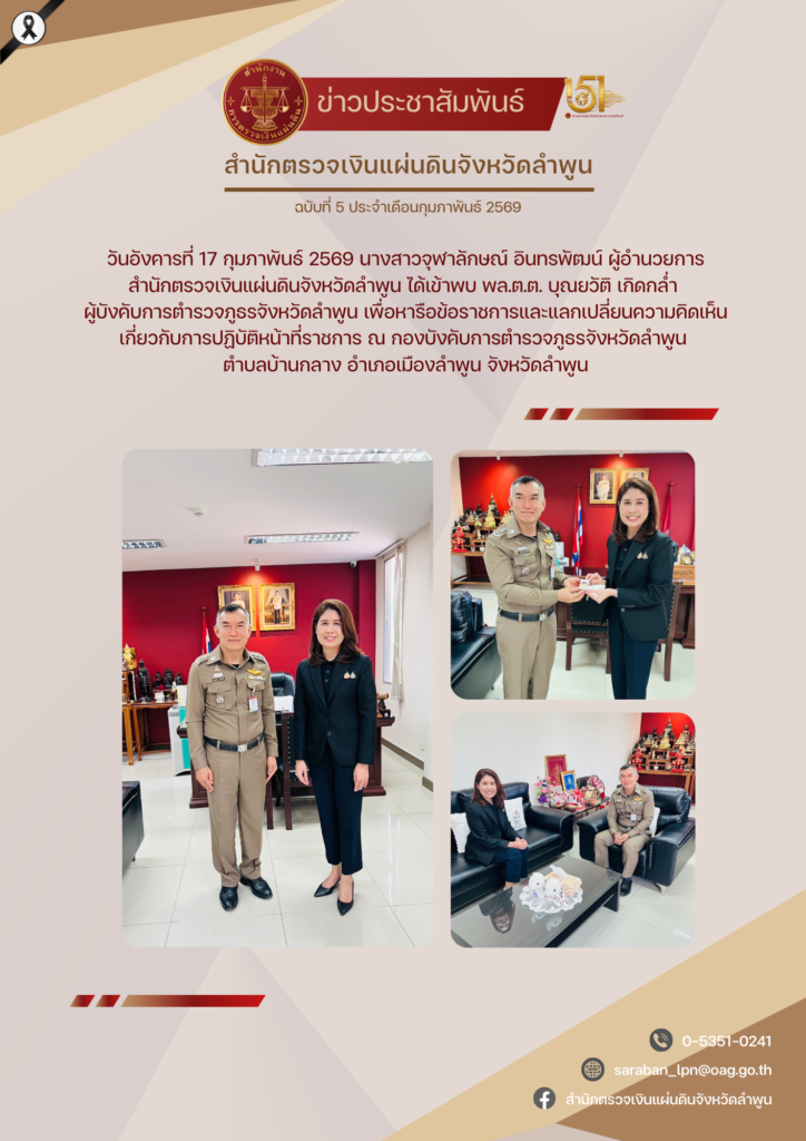 วันอังคารที่ 17 กุมภาพันธ์ 2569 เวลา 11.00 น. นางสาวจุฬาลักษณ์ อินทรพัฒน์ ผู้อำนวยการสำนักตรวจเงินแผ่นดินจังหวัดลำพูน ได้เข้าพบ พล.ต.ต. บุณยวัติ เกิดกล่ำ ผู้บังคับการตำรวจภูธรจังหวัดลำพูน เพื่อหารือข้อราชการและแลกเปลี่ยนความคิดเห็นเกี่ยวกับการปฏิบัติหน้าที่ราชการ ณ กองบังคับการตำรวจภูธรจังหวัดลำพูน ตำบลบ้านกลาง อำเภอเมืองลำพูน จังหวัดลำพูน