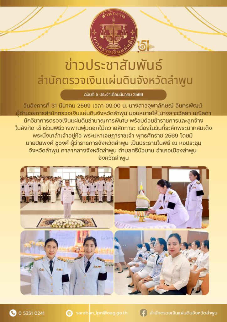 วันอังคารที่ 31 มีนาคม 2569 เวลา 09.00 น. นางสาวจุฬาลักษณ์ อินทรพัฒน์ ผู้อำนวยการสำนักตรวจเงินแผ่นดินจังหวัดลำพูน มอบหมายให้ นางสาววัลยา มณีลดา นักวิชาการตรวจเงินแผ่นดินชำนาญการพิเศษ พร้อมด้วยข้าราชการและลูกจ้างในสังกัด เข้าร่วมพิธีวางพานพุ่มดอกไม้ถวายสักการะ เนื่องในวันที่ระลึกพระบาทสมเด็จพระนั่งเกล้าเจ้าอยู่หัว พระมหาเจษฎาราชเจ้า พุทธศักราช 2569 โดยมี นายปิยพงศ์ ชูวงศ์ ผู้ว่าราชการจังหวัดลำพูน เป็นประธานในพิธี ณ หอประชุมจังหวัดลำพูน ศาลากลางจังหวัดลำพูน ตำบลศรีบัวบาน อำเภอเมืองลำพูน จังหวัดลำพูน