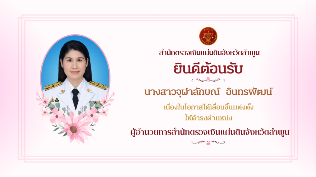 สำนักตรวจเงินแผ่นดินจังหวัดลำพูน ยินดีต้อนรับ นางสาวจุฬาลักษณ์ อินทรพัฒน์ เนื่องในโอกาสได้รับแต่งตั้งให้ดำรงตำแหน่ง ผู้อำนวยการสำนักตรวจเงินแผ่นดินจังหวัดลำพูน