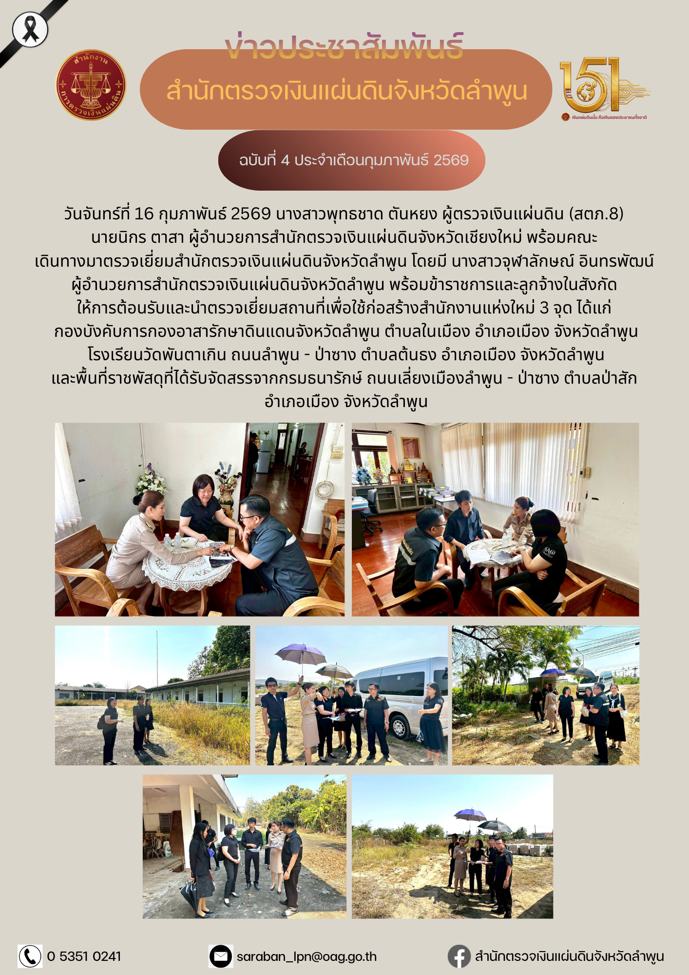 วันจันทร์ที่ 16 กุมภาพันธ์ 2569 เวลา 11.00 น. นางสาวพุทธชาด ตันหยง ผู้ตรวจเงินแผ่นดิน (สตภ.8) นายนิกร ตาสา ผู้อำนวยการสำนักตรวจเงินแผ่นดินจังหวัดเชียงใหม่ พร้อมคณะ เดินทางมาตรวจเยี่ยมสำนักตรวจเงินแผ่นดินจังหวัดลำพูน กุมภาพันธ์ 16, 2026กุมภาพันธ์ 22, 2026