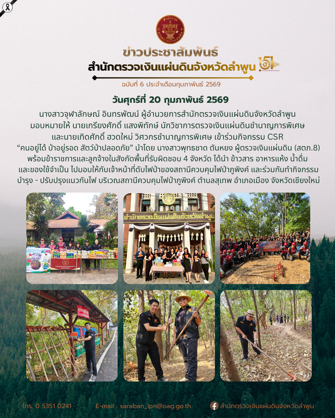 วันศุกร์ที่ 20 กุมภาพันธ์ 2569 นางสาวจุฬาลักษณ์ อินทรพัฒน์ ผู้อำนวยการสำนักตรวจเงินแผ่นดินจังหวัดลำพูน มอบหมายให้นายเกรียงศักดิ์ แสงพิทักษ์ นักวิชาการตรวจเงินแผ่นดินชำนาญการพิเศษ พร้อมด้วยข้าราชการในสังกัดเป็นตัวแทน เข้าร่วมกิจกรรม CSR “คนอยู่ได้ ป่าอยู่รอด สัตว์ป่าปลอดภัย” กุมภาพันธ์ 20, 2026กุมภาพันธ์ 22, 2026